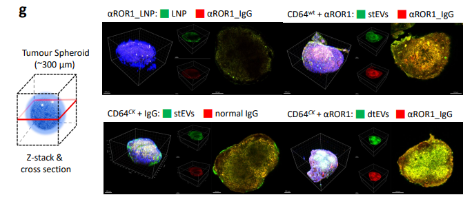 图3g. 经EV给药后的靶向细胞(例如肿瘤细胞球)对EV的摄取与组织渗透有所改善,远优于LNP;因为肿瘤细胞球对LNP的摄取与组织渗透程度很差。