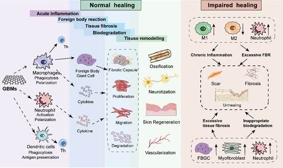 结合团队的前期研究,作者综述了GBMs在骨、神经、皮肤和心血管组织工程中的应用,强调了GBMs的免疫调节功能可促进组织再生。作者重点综述和讨论了GBMs介导的先天免疫细胞在组织愈合过程中发生的序贯性免疫调节机制。在组织愈合过程中,GBMs介导的炎症反应、异物反应、组织纤维化、GBMs生物降解等多种免疫反应相互关联、相互影响,共同影响组织再生的最终结局。作者总结了GBMs的免疫调节策略的局限性以及优化GBMs在组织工程中应用的思路,有助于GBMs更好地应用于组织工程。