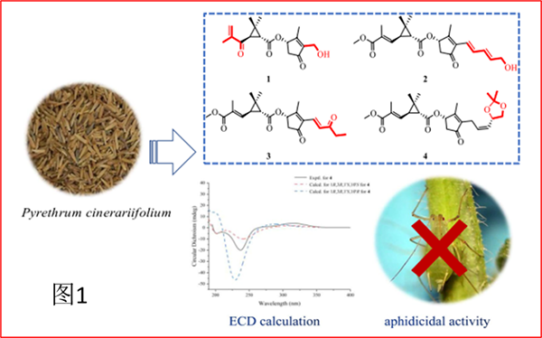 除虫菊(Pyrethrum cinerariifolium Trev.)是全球最著名的杀虫植物,其干花中杀虫成分除虫菊酯因其高效、安全、低毒、无残留,一直是绿色农业中的首选杀虫剂。中国科学院昆明植物研究所邱明华研究团队完成了除虫菊的推广种植,研发了二氧化碳超临界萃取技术(一代)、精制纯化技术(二代)为核心的两代现代天然除虫菊酯农药生产技术,并帮助企业实现规模化生产应用,形成我国除虫菊酯农药产业。该成果2020年获得了云南省科技进步一等奖。为发现新型菊酯类杀虫活性分子,邱明华团队对除虫菊种子进行了深入系统的研究,分离得到全部天然菊酯杀虫成分的同时,还发现了4个具有杀虫活性的新菊酯类化合物pyrethrins C-F (1–4)(Natural Products and Bioprospecting,2023,13:22,图1)。在用干花生产天然除虫菊酯过程中,每年有大量的除虫菊花蜡粗品被作为工业废弃物处理,在综合利用废弃物研究中,近期邱明华团队从除虫菊花蜡中发现了含量较高的C23,C25奇碳脂肪烷醇,这是比较罕见的奇碳脂肪醇新资源。