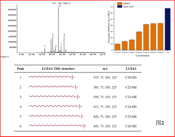 邱明华团队从除虫菊干花生产天然菊酯农药过程中,对作为工业废弃物的除虫菊花蜡,纯化精制工艺研发,并对精制产品进行组成成分分析。长链脂肪醇定量分析结果发现,精制产品中总脂肪醇含量74.5%,其中C20-OH (Eicosanol) 1.36%,C22-OH (Docosanol)11.20%,C23-OH (Tricosanol)3.11%,C24-OH (Tetracosanol)38.88%,C25-OH (Pentacosanol)4.54%,C26-OH (Hexacosanol)15.37%;除虫菊蜡精制产品中C23,C25总含量可达7.65%。这是C23,C25奇碳脂肪醇比较罕见的新资源,为此推测了一个C23,C25奇碳脂肪醇的生物合成途径。同时还完成了除虫菊蜡精制抑制络氨酸酶活性试验,有一定活性,与对照品曲酸比较有较大差距。但作为奇碳脂肪醇的新资源,除虫菊干花蜡在美妆和化工产品中做辅料原料应用应该是具有特色和前景的。