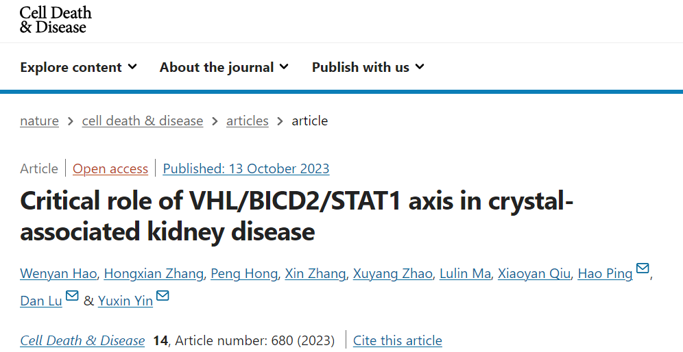 2023年10月13日,北大-清华生命科学联合中心、北京大学基础医学院尹玉新课题组以及吕丹课题组在Cell Death & Disease杂志上联合发表了题为Critical role of VHL/BICD2/STAT1 axis in crystal-associated kidney disease的文章,首次揭示了VHL/BICD2/STAT1信号通路在结石诱导的肾脏炎症性损伤过程中的重要作用。