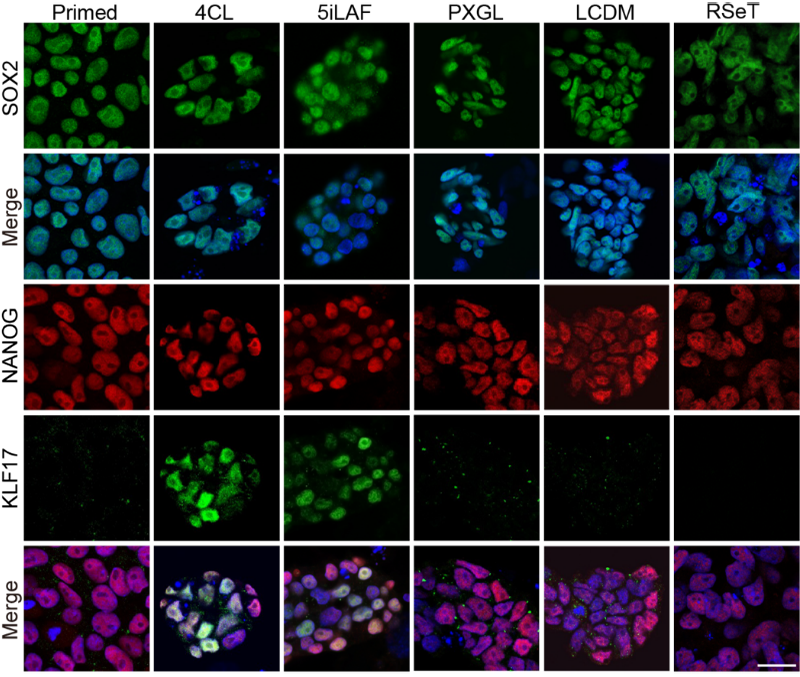 图1.不同培养条件下猴胚胎干细胞中SOX2,NANOG和KLF17的免疫荧光。
