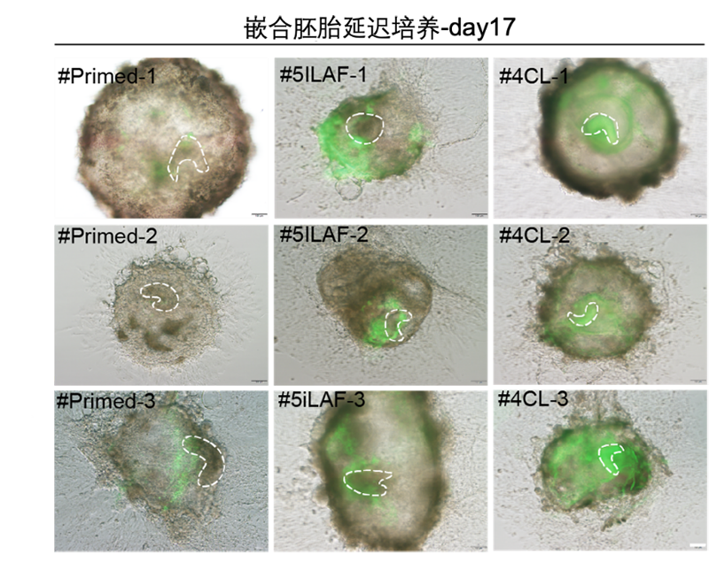 胚胎干细胞注射入受体胚胎后的快速凋亡是影响胚胎干细胞成功嵌合的关键。研究团队选用绿色荧光蛋白标记的4CL条件下的胚胎干细胞进行猴胚胎注射实验,通过测试干细胞注射入胚胎后的不同培养基和培养时间的组合,最终得到了既不影响胚胎正常发育又能保证干细胞存活的最优嵌合胚胎培养条件。而且5iLAF和Primed体系下的胚胎干细胞在该优化条件下也表现出胚胎注射后的高存活率。将注射了4CL和5iLAF干细胞的嵌合胚胎分别在体外延迟培养到第17天,发现注射的胚胎干细胞仍然可以高效存活,单细胞测序表明猴胚胎干细胞可以与受体胚胎细胞同步发育,并且贡献到第17天猴胚胎的不同细胞谱系中。