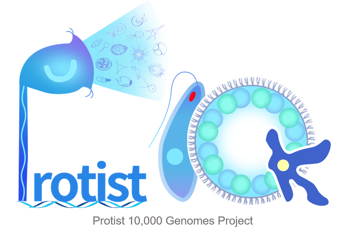 “万种原生生物基因组计划(P10K)”的标志。设计理念:标志由不同原生生物组成。其中钟虫(纤毛虫)代表字母“P”,裸藻(鞭毛虫)和团藻(绿藻)的组合代表数字“10”,阿米巴代表字母“K”。双螺旋既代表DNA又代表水波,即原生生物生存的水环境。“P”中喷发出诸多原生生物,代表1676年列文虎克发现钟虫之后,高度多样的各种原生生物被发现。