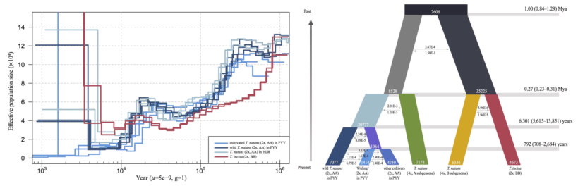 近日,东亚植物演化、保护与利用学科组邱英雄研究员团队在国际植物学期刊Plant Biotechnology Journal上在线发表题为“Genome sequencing and transcriptome analyses provide insights into the origin and domestication of water caltrop (Trapa spp., Lythraceae)”的研究论文。研究团队首先通过基因组测序和组装获得了高质量的四倍体欧菱(T. natans, 2n = 4x = 96)参考基因组,并对中国分布范围内的栽培欧菱(2x)、野生欧菱(2x, 4x)以及细果野菱(2x)共57个个体进行了重测序,确定了菱属三种基因组类型,即AA、BB和AABB。模型模拟结果显示,二倍体欧菱(AA)与细果野菱(BB)的分化发生在约1个百万年前,气候动荡导致两物种在更新世中晚期(mid-to-late Pleistocene, 0.23–0.31 Ma)通过杂交形成异源四倍体欧菱(AABB)(图1)。利用系统发育分析证实所有栽培菱均来源于二倍体欧菱(AA),起源于长江流域。与考古证据及历史文献记载一致,模型模拟结果支持栽培菱角的驯化历史最早可追溯至新石器时期(约6,300年),并在南宋时期(约800年)得到进一步改良,产生诸如乌菱等特色品种。选取二倍体欧菱野生和栽培群体,在基因组水平检测人工选择信号,共确定受选择区段126个,受选择基因共205个,其中不乏与果实和根系发育相关的基因,如SUS3,XTH8,SAC7,RPD1,OCT1。研究团队进一步采集野生菱角和两个栽培品种(“乌菱”和“南湖菱”)成熟叶片和5个花/果期(F0–F5)样品进行转录组测序。差异表达分析表明,野生菱和栽培菱之间的差异表达基因数量远远高于两个栽培菱之间的差异表达基因数量。同时,研究团队将野生菱和栽培菱的5个花/果期的差异表达基因划分为四种时序表达模式,并且发现野生菱和栽培菱之间的时序表达模式存在较大差异。本研究通过解析菱属植物的起源和驯化过程,加深了我们对水生植物的多倍体起源、演化和驯化的认识,佐证了长江流域是我国农业文明的重要起源地;同时,大量基因组资源的解析也为菱属分子辅助育种提供了重要基础。