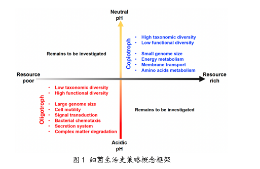 研究依托我国森林生物多样性监测网络,结合宏基因组和扩增子测序分析,比较了细菌种类和功能多样性的分布格局。结果表明,随着土壤pH由酸性升高到中性,细菌的种类多样性升高,而细菌的功能基因多样性则下降。同时,细菌的平均基因组大小与土壤pH显著负相关。进一步分析发现,适应酸性环境的细菌群落在细胞游动、胞外酶分泌、信号转导、化感效应和复杂物质降解方面的功能更强;而适应中性环境的细菌群落在能量代谢、膜转运和氨基酸代谢方面的功能更强。在此基础上,研究团队提出了基于资源和胁迫划分的四象限框架。