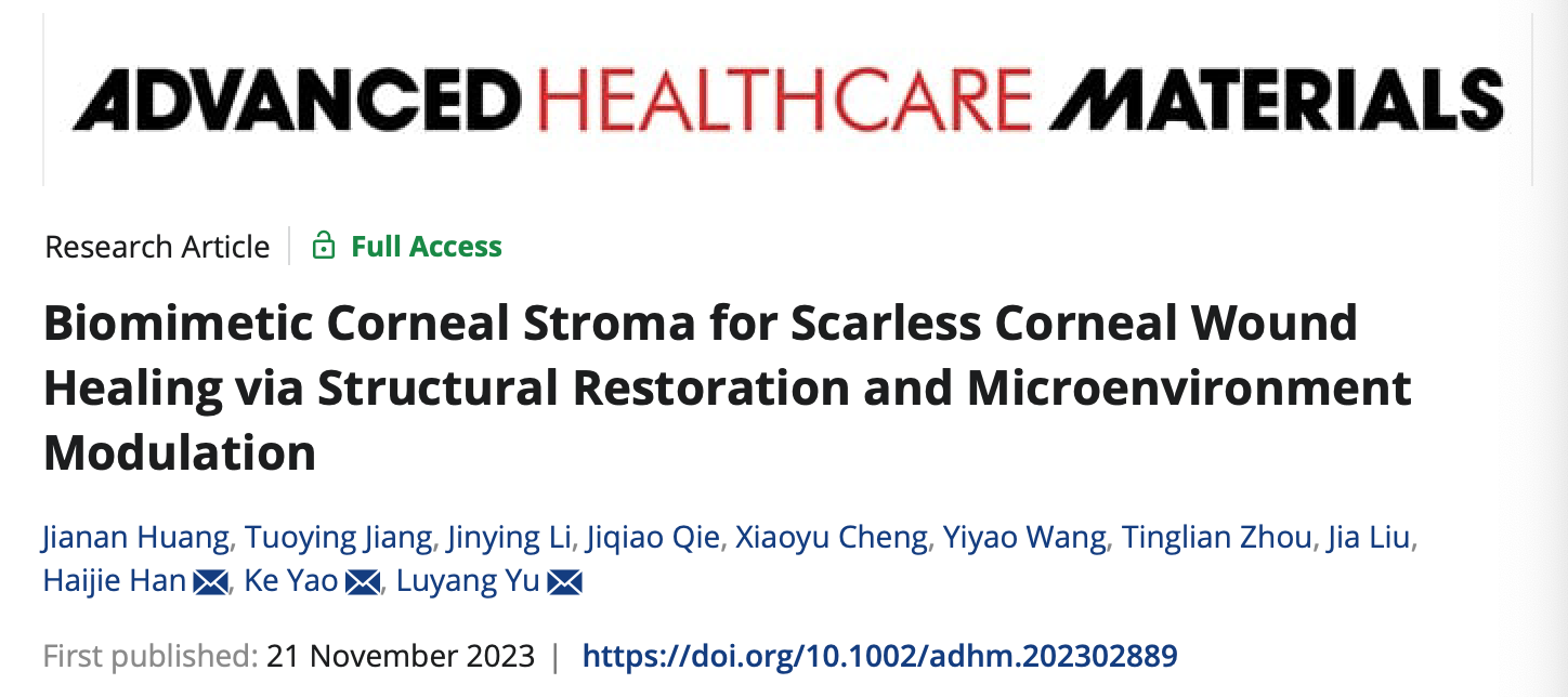 2023 年 11 月 21 日,浙江大学生命科学学院 余路阳 教授 团队与浙大二院眼科中心 姚克教授 团队联合在 Advanced Healthcare Materials 杂志上发表题为“ Biomimetic Corneal Stroma for Scarless Corneal Wound Healing via Structural Restoration and Microenvironment Modulation ” 的研究论文
