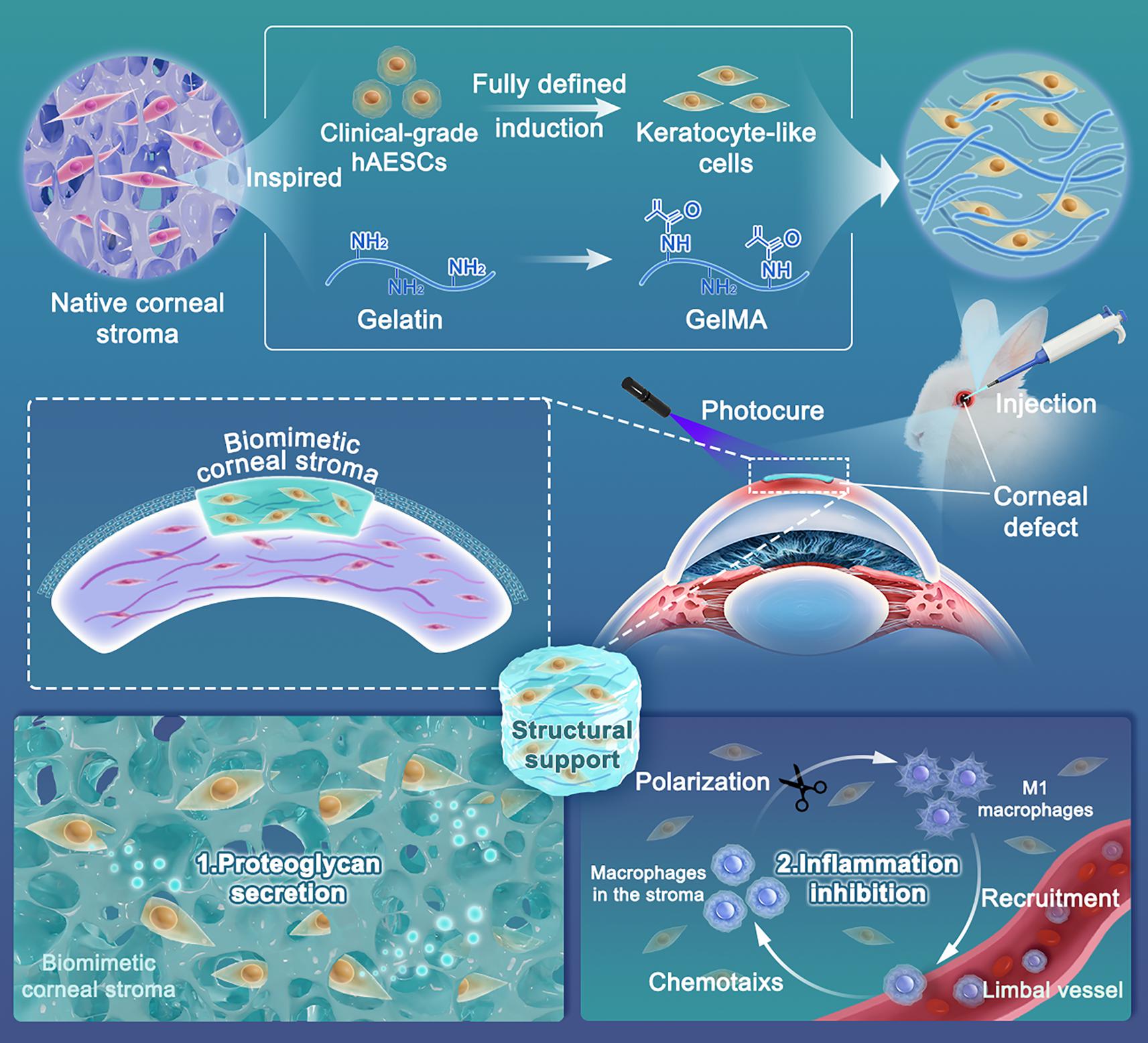 在该研究中,作者们选用了一种具有免疫调节功能以及低免疫原性的新型围产期干细胞——人羊膜上皮干细胞。通过建立无血清诱导分化体系,作者们从临床级别的人羊膜上皮干细胞中诱导分化出角膜基质细胞。分化后的细胞除了获得角膜基质细胞的特异性表型外,还显示出较强的免疫调节特性,能有效调控角膜损伤微环境。此外,作者们制备了一种可光固化的明胶基水凝胶,作为细胞支架用于构建仿生角膜基质。体外实验验证了水凝胶材料良好的生物相容性。在体内实验中,仿生角膜基质无需缝线或纤维蛋白胶,便能迅速恢复角膜结构和力学性能。同时,仿生角膜基质中的基质细胞通过分泌蛋白聚糖和抑制炎症级联反应,有效重塑组织微环境,抑制约75%的角膜瘢痕形成。因此,这种新的仿生角膜基质能够促进角膜的少瘢痕化修复,为角膜损伤后提高视觉质量提供了更好的解决方案,具有较强的临床转化潜力。
