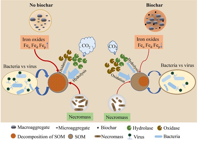 氧化还原诱导的铁(Fe)转化是厌氧水稻土中至关重要的生物地球化学过程。铁保护对水稻土有机碳积累具有重要作用。同时,铁保护也可以通过调控铁还原相关微生物群落促进土壤有机碳的分解。在生物炭添加条件下,铁氧化物如何影响水稻土有机碳固存尚未明晰。此外,生物炭添加会刺激土壤中微生物的生长繁殖,病毒可通过直接裂解细菌或者调控养分供应间接影响细菌群落。然而,生物炭添加条件下细菌-病毒相互作用如何调控水稻土有机碳动态并不明确,细菌-病毒相关作用与铁保护在土壤有机碳固存方面的相对贡献有待进一步揭示。