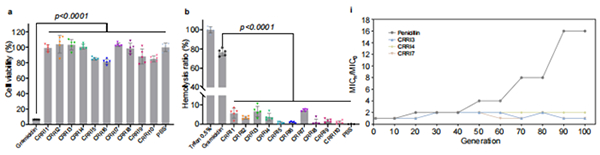 图2 抗菌六肽体外毒性、细菌耐药性测试
