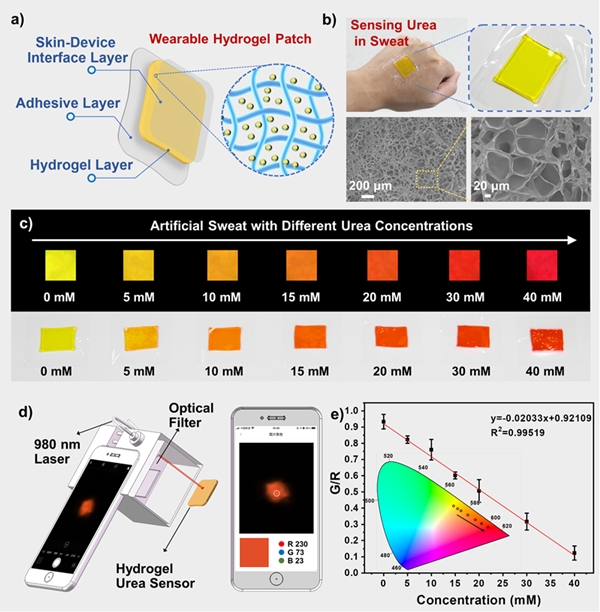 图. (a)设计可穿戴水凝胶传感贴片;(b)汗液中尿素的传感和水凝胶的SEM图像;(c)水凝胶传感贴片在980 nm激发光和日光下对尿素的响应;(d)便携式尿素检测传感平台;(e) G/R比值与尿素浓度在0-40 mM范围内的线性关系。
