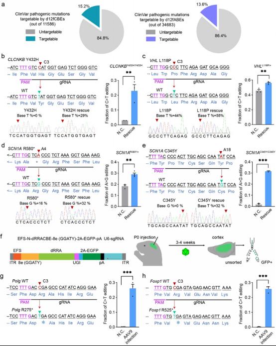 最后的应用探索研究中,研究团队成功利用新开发的miniABEs和miniCBEs在细胞模型中实现了致病点突变的高效修复,并利用AAV递送系统在小鼠大脑中实现了致病点突变的体内高效诱导,这证实了本研究开发的迷你碱基编辑器具有广阔的应用前景(图3)。