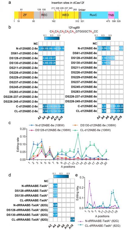 前期研究指出,腺嘌呤脱氨基酶TadA-8e与迷你CRISPR系统Cas12f组合可获得活性窗口为A3-A4的miniABEs【14】。本课题中,研究人员将TadA-8e及各类TadA突变体与Cas12f通过不同的融合等方式进行组合筛选,开发出一系列具有更高活性和编辑窗口多样性的miniABEs,其中C末端融合的CL-dRRAABE-TadA*(82G)具有全新的活性窗口A16-A17,这进一步拓展了miniABEs的应用场景(图1)。