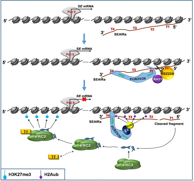 研究人员通过RNA体内pull down寻找到了SEAIRa的互作蛋白E3连接酶PUB25/26以及类泛素蛋白RUB1。SEAIRa招募PUB25/26以及RUB1引起SE第11个外显子区域H2Aub修饰。此外,PUB25/26会影响SEAIRa 5’端的切割,并释放出5’端片段,游离的5’片段可以与PRC2核心成员EMF2互作,进而招募PRC2复合体引起SE第一个外显子区域H3K27me3修饰。SE基因座不同位点的抑制性H2Aub和H3K27me3修饰协同调节SE染色质状态并抑制SE表达。