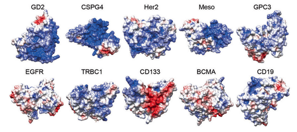 (临床中常见的10种CAR的设计。其中蓝色为正电荷基团,红色为负电荷基团。)