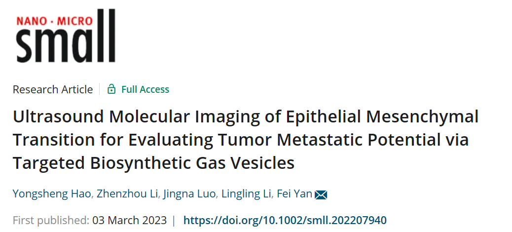 近日,中国科学院深圳先进技术研究院合成生物学研究所严飞研究员团队最新成果以“Ultrasound Molecular Imaging of Epithelial Mesenchymal Transition for Evaluating Tumor Metastatic Potential via Targeted Biosynthetic Gas Vesicles”为题在线发表于材料科学知名期刊Small (IF:15.3)。该工作利用生物合成的纳米气囊实现了对肿瘤上皮-间质转化(EMT)动态变化的超声分子成像,为评估肿瘤转移潜力提供了新方法。