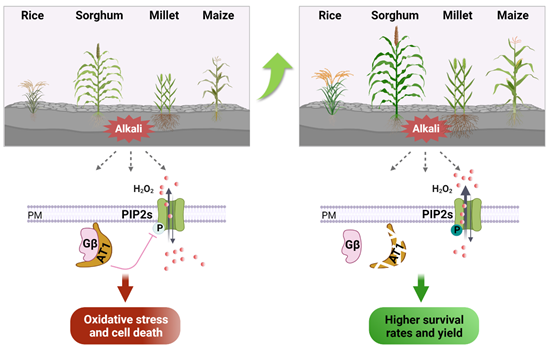 为揭示AT1调控植物碱胁迫响应的分子机制,利用免疫共沉淀联合LC-MS蛋白质谱的方法鉴定到AT1的互作水通道蛋白SbPIP2;1/2;2和SbPIP1;3/1;4,并证实AT1与它们在植物体内体外均存在相互作用。利用pH不敏感的H2O2特异性荧光探针Cyto-roGFP2-Orp1进行实验,发现在盐碱胁迫环境下,PIP2;1促进过氧化氢(H2O2)外排以减轻碱胁迫对细胞带来损伤,AT1/GS3通过抑制PIP2;1蛋白的磷酸化水平影响细胞中活性氧水平。因此,在碱胁迫条件下,AT1可能通过减弱PIP2;1的磷酸化来调节植物细胞中的ROS稳态,植物进而表现出碱敏感的表型;改造该基因则可缓解此毒害,赋予植物高耐盐碱性(图1)。