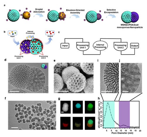 图(a)乳液定向诱导构建双球状双介孔非对称纳米粒子流程图;(b,c)生物质逻辑门示意图;(d-g)双球状双介孔非对称纳米粒子透射电镜、扫描电镜、元素分布图;(h-j)双球状双介孔非对称纳米粒子孔径分布及对应孔径高倍透射电镜图