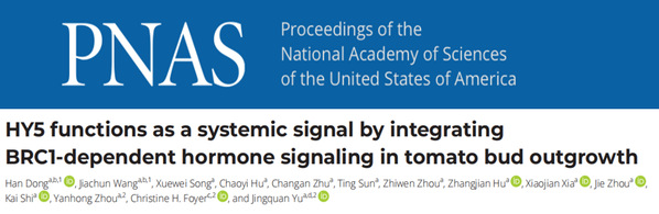 2023年4月10日,浙江大学喻景权/周艳虹团队围绕番茄植株株型再次在PNAS在线发表了题为HY5 functions as a systemic signal by integrating BRC1-dependent hormone signaling in tomato bud outgrowth的研究论文,揭示了光信号节链在番茄侧枝发育中的作用。