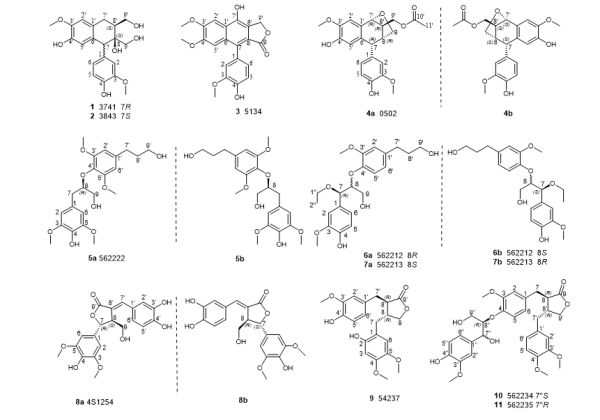 从水母雪莲花全草中分离鉴定200余个化合物(新化合物25个),主要为萜类、木脂素类、黄酮类、苯丙素类、生物碱类。分离的25个新化合物,包含8个新萜和17个木脂素。8个萜类新化合物,除一个为单萜外,其余均为倍半萜类化合物。包括2个罕见的botryane骨架型倍半萜和5个甲基环己烯型倍半萜及其降碳倍半萜。实验采用了[Mo2(OAc)4]化学反应方法确定了化合物柔性侧链上羟基的绝对构型,并采用计算ECD的方法对环上羟基的构型进行确定。17个新木脂素化合物,包括5对对映异构体和7个新单体化合物。实验选用DAICEL手性拆分色谱柱,采用LC-CD技术,对对映异构体类木脂素新化合物进行手性拆分和在线CD测定,得到5组近似镜像CD图。
