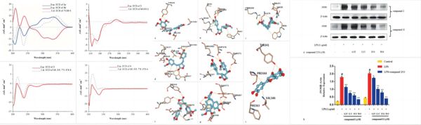 图3 部分化合物ECD谱图、分子对接图及抗炎活性Western Blot图