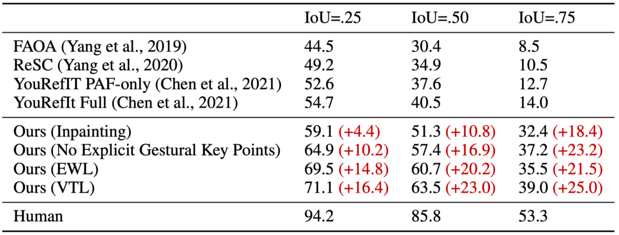 在0.25、0.50和0.75的IoU阈值下,课题组的方法分别优于现有的最先进方法16.4%、23.0% 和 25.0%(表1)。具体来说,课题组的模型比没有明确利用非语言手势信号的visual grounding 方法(Yang et al.,2019;2020) 表现更好。课题组的方法也比YouRefIt (Chen et al.,2021)中提出的方法表现更好,后者没有利用触摸线或transformer模型来完成多模态任务。