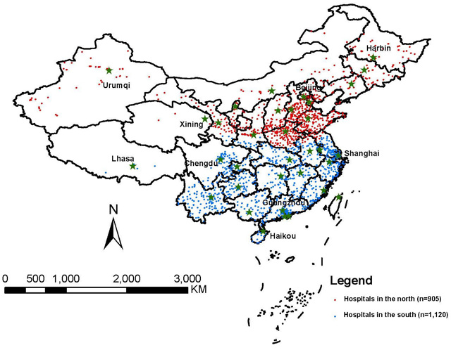 图1. 我国2025家医院的分布地图