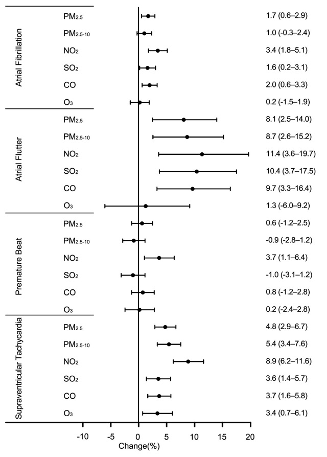 图2. 在暴露当天(0-24小时),空气污染物浓度每升高一个四分位间距引起心律失常发作风险增加的百分比