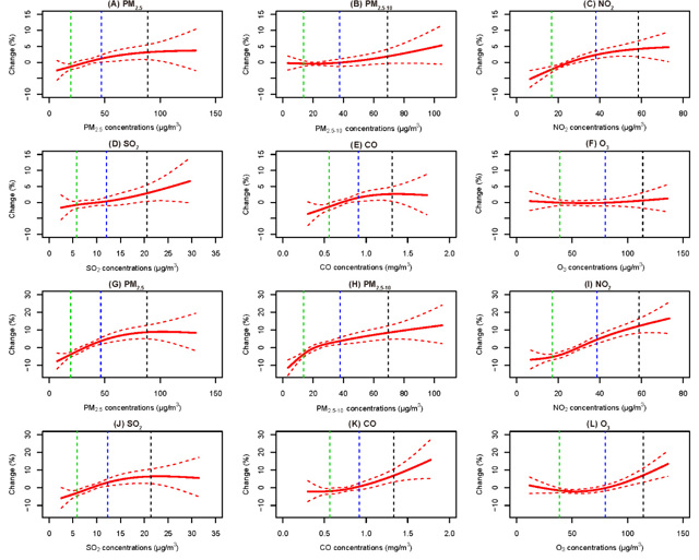 注:垂直虚线表示空气污染物的浓度节点(绿色:第25百分位数,蓝色:第75百分位数,黑色:第95百分位数)