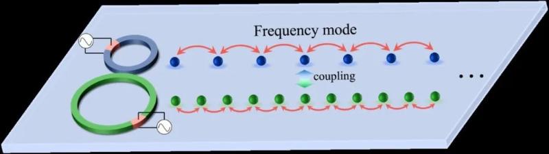 图2 由谐振环系统构建合成频率维度中一维莫尔晶格示意图