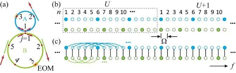 在研究中,他们通过选取不同长度的谐振环,并在两个谐振环上加入谐振的电光调制,谐振环之间通过耦合实现双层之间的相互作用,从而在频率维度中实现不同周期的合成晶格结构。因此,两个环的谐振频率间隔之比可以充当“莫尔角”(图2)。研究发现,通过调节耦合强度,可以实现控制能带从非平坦到平坦的转变,即实现在光频率上的非局域与局域之间的可调切换。当耦合强度增加到一定阈值的时候,该合成结构对应的能带都是平坦的,并且每一条平坦能带对应一个局域的频率模式。