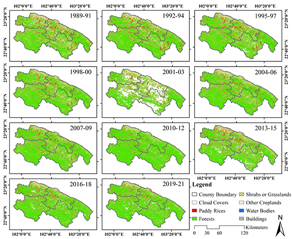 近日,中国科学院昆明植物研究所许建初研究团队与中国农业科学院农业资源与农业区划研究所周颖研究团队围绕哈尼梯田保护区开展了梯田水稻种植的时空结构分析。研究团队通过半结构式访谈获取了哈尼梯田区水稻的物候与农事节气信息,再利用Google Earth Engine和水稻物候特征,以三年为时间间隔绘制了过去三十年(1989-91年至2019-21年)哈尼梯田遗产区所在四县的土地利用分布数据。结果得出,哈尼梯田遗产区的水稻种植面积总体呈现减少的态势,从1989-91年的133.79 km2(约占梯田遗产区总面积的13.66%)降至2010-12年的54.52 km2(5.57%),而后增至2013-15年的135.95 km2(13.88%),此后又减少到2019-21年的100.71 km2(10.28%)。