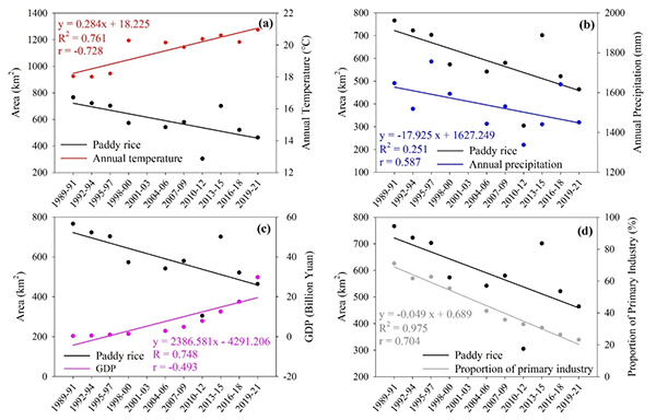 研究团队进一步通过分析梯田所在四县1989-2021年的气象数据与社会经济情况来探究哈尼梯田水稻种植面积消长的驱动因子。自然因素方面:依赖亚洲季风气候的哈尼梯田种植面积对水资源十分敏感。1990年以后年降雨量总体呈偏小趋势,其中,与1989-91年相比,2019-21年哈尼梯田所在四县的年平均气温升高了约2.92℃,年降水量减少了约196.63毫米。保护区内的水稻面积也在2004-06和2010-12这两个干旱事件发生的时期分别降至了94.61 km2和54.52 km2,水资源约束日益趋紧,梯田生态系统面临失衡风险。社会因素方面:2013年红河哈尼梯田被列入联合国教科文组织世界遗产名录使得梯田保护区农民的保护意识与种植积极性都得到提高,因此水稻种植面积在2013-2015年间达到最高峰。但是随着社会经济进一步发展,人口的增加导致人地矛盾突出。稻作生产不能满足就业生存的需要,大量青壮年劳动力外流、农耕人口呈老龄化和女性化趋势。劳动力结构与经济收入的变化,加上季节性气候干旱与水利设施建设滞后,是造成哈尼梯田种植面积减少的重要原因。