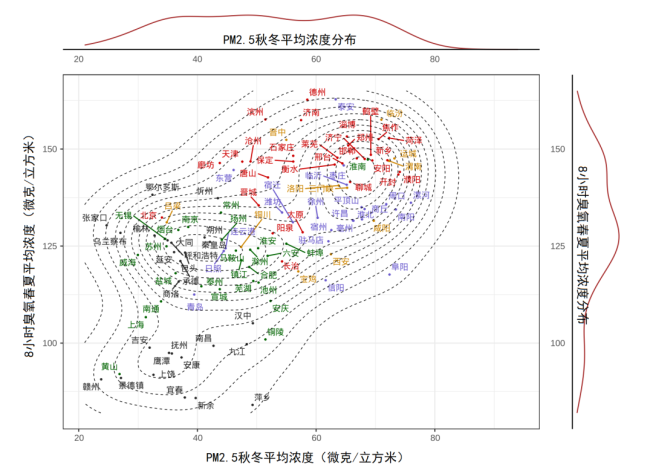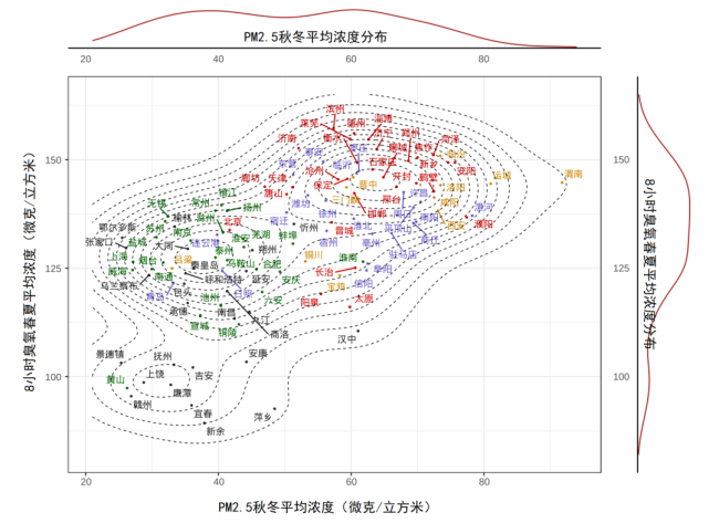 我国仍然面临PM2.5和臭氧的复合型污染问题。“3+110”城市中PM2.5浓度高的城市臭氧浓度也高,如“2+26”城市、汾渭平原11市和苏皖鲁豫交界地区;而PM2.5浓度低的城市臭氧浓度往往也低,如长三角和冀晋鲁豫陕的边缘城市。这说明有必要通过协同控制措施,治理PM2.5与臭氧两种污染物。
