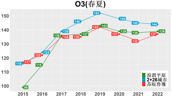 2022年,PM2.5、PM10、二氧化硫和春夏臭氧均出现规模性反弹,涉及污染物种多、涵盖范围广。其中,基于经过气象调整的年平均值统计,PM2.5在北京、陕西和山西三省市反弹,“3+110”城市中有37个城市出现年均浓度上升;PM10在北京、山西、陕西、河南和河北五省市反弹,56个城市出现年均浓度上升;二氧化硫在上海、山东、河南、天津、江苏、北京、河北和陕西八省市反弹,63个城市出现年均浓度上升;春夏八小时臭氧在上海、江西、陕西、江苏、安徽、河南、北京和山东八省市反弹,“3+110”城市中有78个城市出现年均浓度上升。从极端污染情况看,PM2.5的年均90%分位数浓度在北京、山西、陕西三省市反弹,35个城市出现90%分位数浓度上升。春夏八小时臭氧的90%分位数浓度在北京、上海、河南、山东、江苏、陕西、江西七省市反弹,有66个城市出现90%分位数浓度上升。