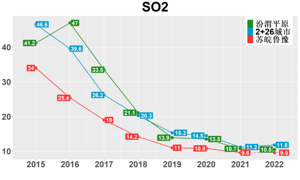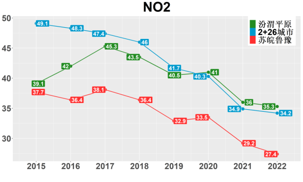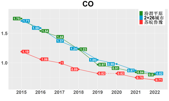 “2+26”城市、汾渭平原和苏皖鲁豫交界地区六种污染物年平均浓度时间序列图(一氧化碳的单位为毫克/立方米,其余污染物的单位为微克/立方米)