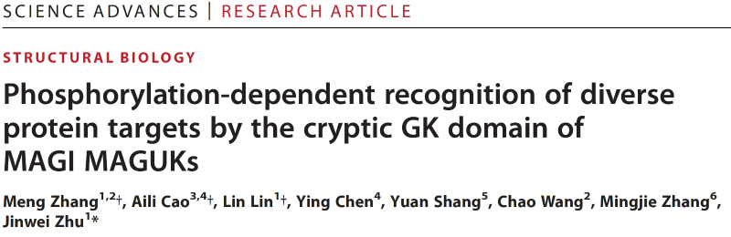 2023年5月11日,上海交通大学Bio-X研究院朱金伟课题组在Science Advances杂志在线发表题为Phosphorylation-dependent recognition of diverse protein targets by the cryptic GK domain of MAGI MAGUKs的研究论文,发现MAGI家族蛋白的PDZ-GK超结构域是一种新型磷酸化蛋白识别模块,并阐释了其识别磷酸化蛋白的分子机制。