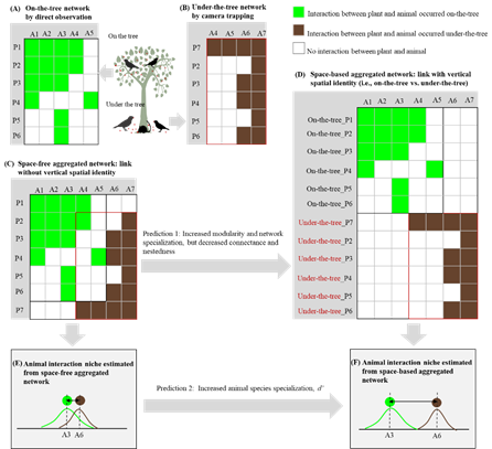 通过结合直接观测树上和红外相机观测树下的方法构建了果实-食果动物互作网络,构建结合直接观测和红外相机监测得到的树上网络(图1A)、树下网络(图1B)和整合食果网络(图1C),并提出了带有空间信息的食果网络(图1D)。通过分析食果网络的结构验证两个预测:(1)在网络分析中加入垂直空间信息后,食果网络的模块化程度增加,而嵌套度降低,(2)在网络分析中加入垂直空间信息后,食果动物的互作生态位分割增加,即物种特化水平增加(图1)。