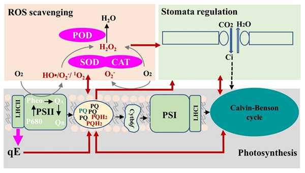 研究结果表明,短命植物尖喙牻牛儿苗在干旱初期气孔导度并未降低甚至有所增强,从而可在较低水分状态下仍维持气孔调节,干旱增强过程气孔调节与非气孔体调节转换的关键水分临界值为56% ± 8.53%,远低于多种中生植物。这一现象与氧化还原位点PQ活性密切相关,PQ的氧化还原态可作为干旱初期短命植物气孔开放的早期信号。而抗氧化酶对活性氧的清除作用和非光化学淬灭两种光保护途径有助于干旱初期PQ还原态的维持,进而调节干旱初期光系统活性的稳定,短期内提高碳同化能力。该研究结果阐明了短命植物在干旱发生时快速生长完成物质积累的光合基础,有助于更好地理解短命植物适应干旱的机制。
