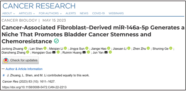 继2021年末在Cancer Research杂志上报道了高胆固醇血症病患血清中ox-LDL作为一种外在系统性的调控肿瘤干性样细胞的重要因子,为肿瘤宏环境(Tumor macroenvironment)作用于肿瘤干性调控提供了一个有力例证之后,复旦大学实验动物科学部严俊课题组、中国科学院上海药物研究所黄锐敏课题组、南京大学附属鼓楼医院郭宏骞主任团队再度携手合作,在2023年5月15日出版的Cancer Research杂志上联袂发表了题为“Cancer-associated fibroblast-derived miR-146a-5p generates a niche that promotes bladder cancer stemness and chemoresistance”的研究论文,报道了膀胱癌微环境中miR-146a-5p高表达的CAF能调控肿瘤细胞干性,进而促进肿瘤对吉西他滨/顺铂联合化疗的耐药。