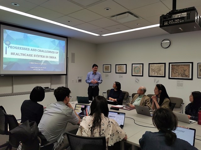 第一天的交流活动中,陈文教授做《中国卫生改革的进展与挑战》的专题报告,介绍我国医疗保障制度和医疗卫生服务体系中的重点改革进展以及所面临的挑战,随后师生就农村医疗卫生服务体系、罕见病保障、健康产业发展、基层医疗卫生服务、商业补充医疗保险等问题展开热烈讨论。第二天的交流活动中,叶志敏教授做《中国卫生改革:现状与未来》的引导性报告,指出中国的卫生服务在可及性、公平性、质量和效率等方面仍需加强,在之后的圆桌讨论中,中美师生就中国卫生制度当前面临的问题展开深入讨论、分享研究和实践中的经验,探讨可能的解决方案以及进一步合作研究的重点方向。