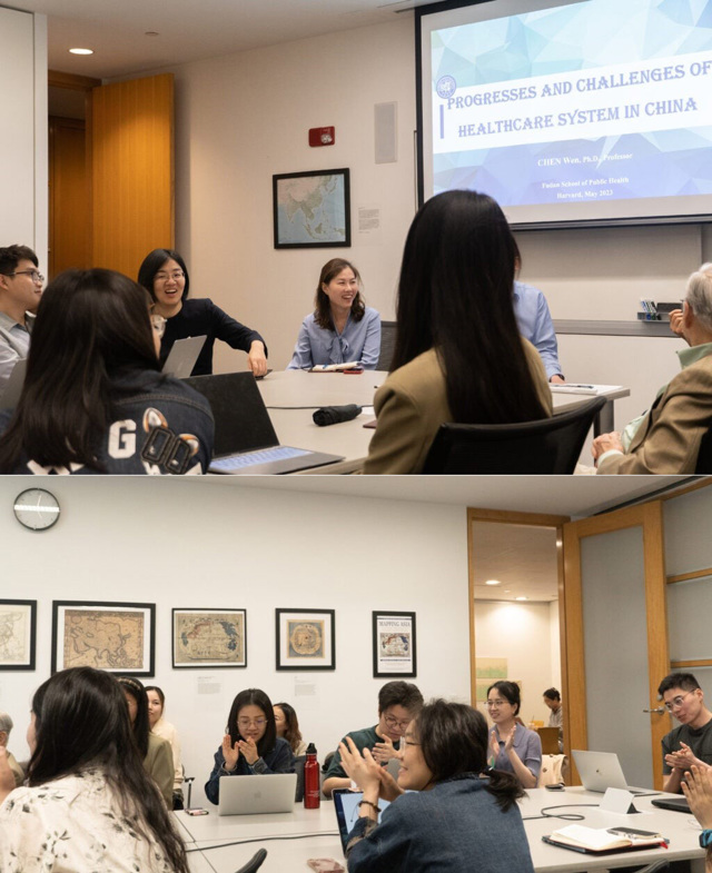 2023年5月11-12日,我院卫生经济学教研室陈文教授、胡敏副教授、张璐莹副教授一行3人受邀访问哈佛大学陈曾熙公共卫生学院,就中国医药卫生体制改革和中美卫生政策合作研究展开交流和讨论。此次交流活动由哈佛大学公共卫生学院全球健康政策和经济学教授、哈佛中国健康合作项目主任叶志敏(Winnie Yip)主持,经济学荣休教授萧庆伦(William Hsiao)及公共卫生学院的研究人员、博士后、研究生等18人参加。