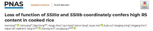 中国科学院遗传与发育生物学研究所李家洋院士课题组与浙江大学原子核农业科学研究所吴殿星、舒小丽教授课题组合作,续2016年PNAS发文(Critical roles of soluble starch synthase SSIIIa and granule-bound starch synthase Waxy in synthesizing resistant starch in rice)后,在水稻抗性淀粉形成机制方面又取得新进展。