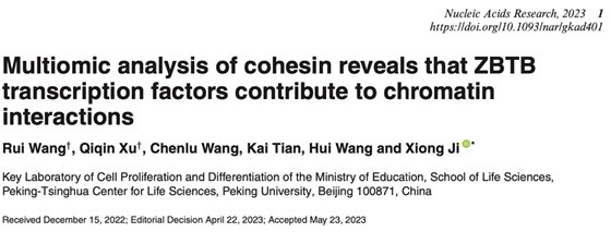 2023年6月2日,北京大学生命科学学院、北大-清华生命科学联合中心季雄课题组在Nucleic Acids Research杂志上在线发表了题为“Multiomic analysis of cohesin reveals that ZBTB transcription factors contribute to chromatin interactions”的研究论文,文中对染色质结构起着关键性调控作用的Cohesin蛋白复合体进行了蛋白质组学分析,并确定了与Cohesin复合体相关的转录因子、RNA结合蛋白和染色质调节因子。随后对蛋白质组结果进行验证和进一步研究,通过蛋白质瞬时降解系统,揭示了ZBTB转录因子蛋白家族可以调控Cohesin在染色质上的结合,并且可以调控三维染色质之间的相互作用和转录抑制,为研究染色质结构调控机理研究提供了新的线索。