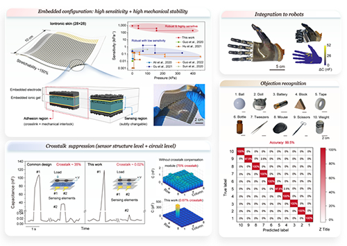 研究成果以“具有嵌入式传感单元,可用于机器人领域的鲁棒、高灵敏且无串扰的离电型蒙皮(Embedment of sensing elements for robust, highly sensitive, and crosstalk-free iontronic skins for robotics applications)”为题,于2023年3月3日发表在《科学进展》(Science Advances)上,论文链接:https://www.science.org/doi/10.1126/sciadv.adf8831