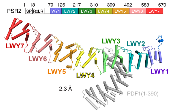 2023年6月26日,中国科学院生物物理研究所王艳丽研究团队与英国塞恩斯伯里实验室(The Sainsbury Laboratory)马文勃研究团队合作在《Cell》杂志发表了题为" Pathogen protein modularity enables elaborate mimicry of a host phosphatase"的文章,首次发现在疫霉属病原微生物中,普遍存在一类WY1-(LWY)n效应子蛋白, 通过保守的PP2A interacting module 挟持宿主细胞中的PP2A核心酶。