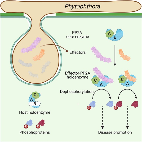 在病原微生物感染植物过程中,为了有效侵染宿主,病原微生物会向宿主细胞中分泌一大类蛋白分子,即效应子(effectors)。效应子通过操纵宿主细胞的免疫相关分子,进而干扰植物细胞的免疫防御过程,从而使得病原菌更容易侵染植物。为了进一步探究效应子与特定宿主分子的相互作用,在本研究中,我们以来自大豆疫霉(Phytophthora sojae)的效应子PSR2为研究对象,通过免疫共沉淀检测,发现其可以挟持宿主细胞中的PP2A核心酶,并形成一种非传统型的全酶形式。该全酶干扰了宿主细胞的某些代谢通路,使得病原微生物更易侵染植物。