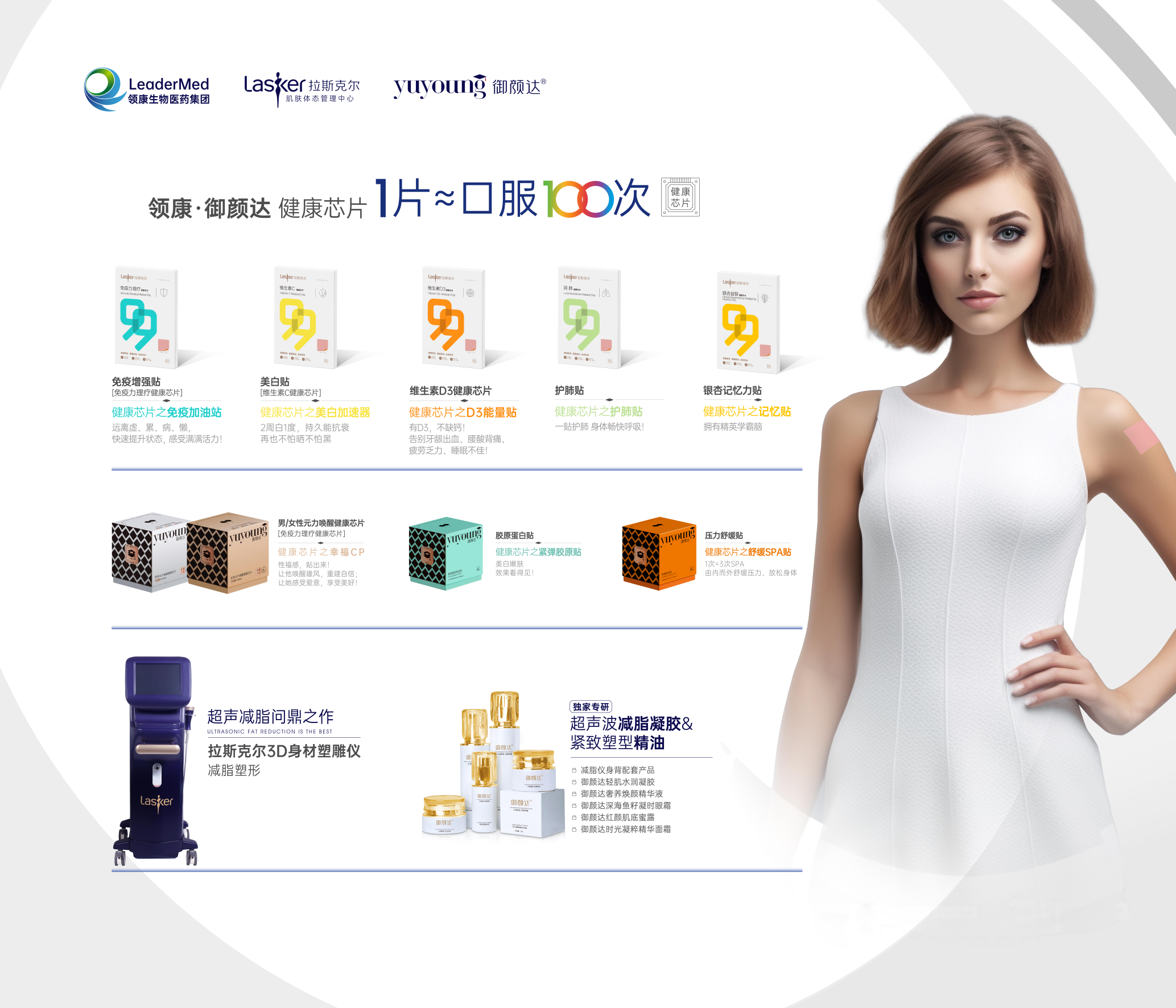 目前,领康生物医药集团在科技转化成果上,已布局减脂降糖领域的Lasker3D身材塑雕仪,以及全球首创双靶点Ⅱ型 糖尿病和减脂的最新药品领康LM-008(目前已进入3期临床阶段,有望成为糖尿病领域里程碑产品);在健康调理领域,已孵化健康芯片全系列产品,应用全球顶尖的全身药物输送技术。