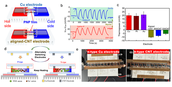 该成果以“基于可逆双性塞贝克系数离子热电材料的循环式热电发电器件(Reversible bipolar thermopower of ionic thermoelectric polymer composite for cyclic energy generation)”为题,于2023年1月19日在线发表于《自然·通讯》(Nature Communications)期刊上