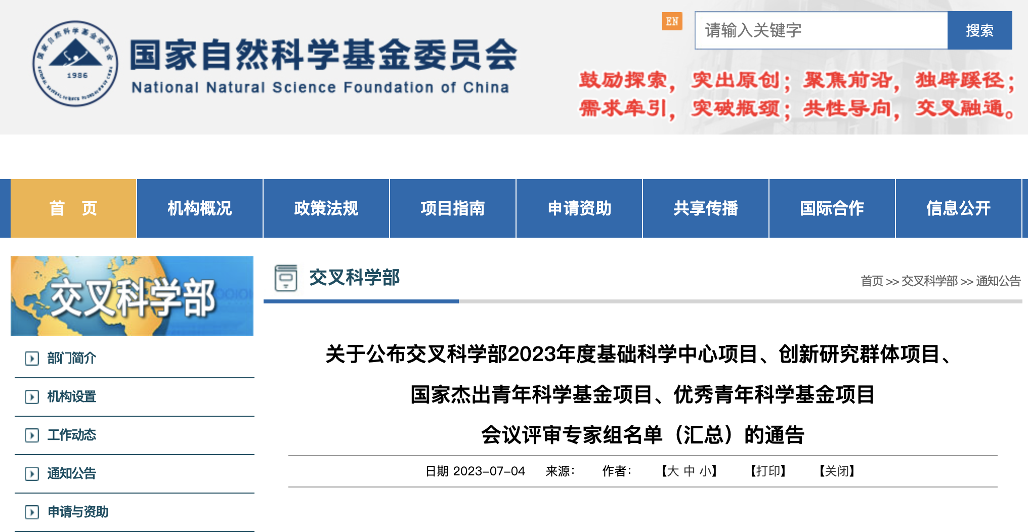 基金委交叉学部公布杰青、优青等4项目会评专家名单